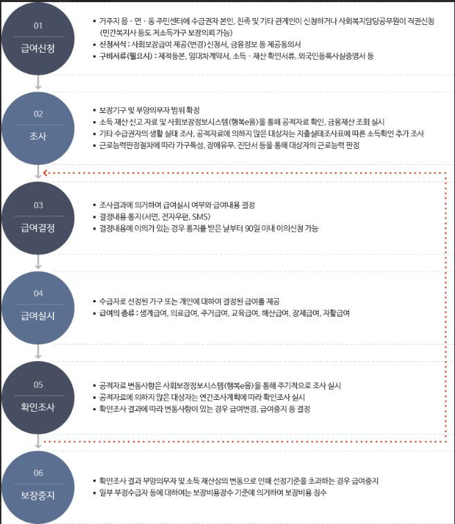 기초 생활 수급권자 본인, 친족이 직접 급여 신청을 할 수 있습니다. 신분증, 가족관계증명서,통장사본, 소득/재산증빙서류,급여명세서 등 준비해야 합니다. 신청장소는 관할 주민센터(직접방문)혹은 인터넷을 통해 신청할 수 있습니다. 신청 후 30일~60일내에 결과가 통보되고, 신청일 기준 지원이 가능하다고 합니다.