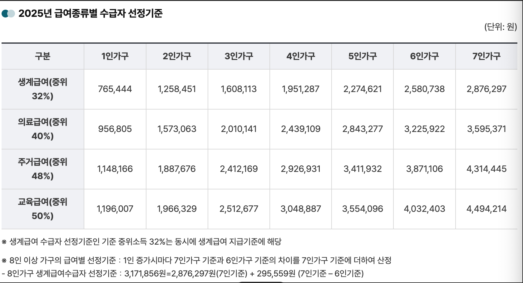 기초생활수급자 선정에서 가장 기본적인 조건은 가구 소득입니다. 기준 중위소득 대비 가구 총소득이 일정 수준 이하일때 생계,의료,주거 교육 급여 항목별로 자격을 부여하고 있습니다.