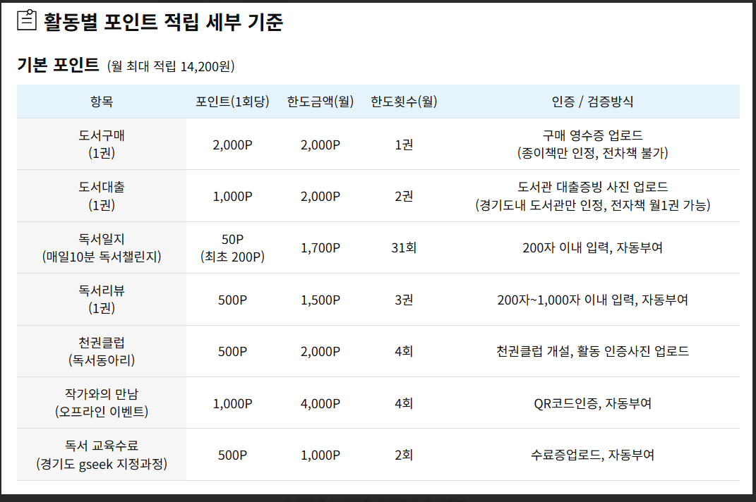 경기도는 독서활동에 대한 보상으로 지역화폐를 지급하는 '천권의독서포인트'정책을 시행하고 있습니다. 경기도와 경기도 평생교육진흥원은 전국지자체 최초 '독서포인트'제도를 도입해 도서구매,도서대출,독서일지작성,리뷰공유 등 독서활동에 포인트를 지급하고 있습니다. 적립된 포인트는 매월 25일 지역화폐로 전환되며 지역서점에서 도서구매 시 사용할 수 있습니다. 올해 하반기 적립 가능 포인트는 인당 최대 3만원 입니다. 관심이 있으신 분들은 아래의 내용을 확인해보시길 바랍니다.